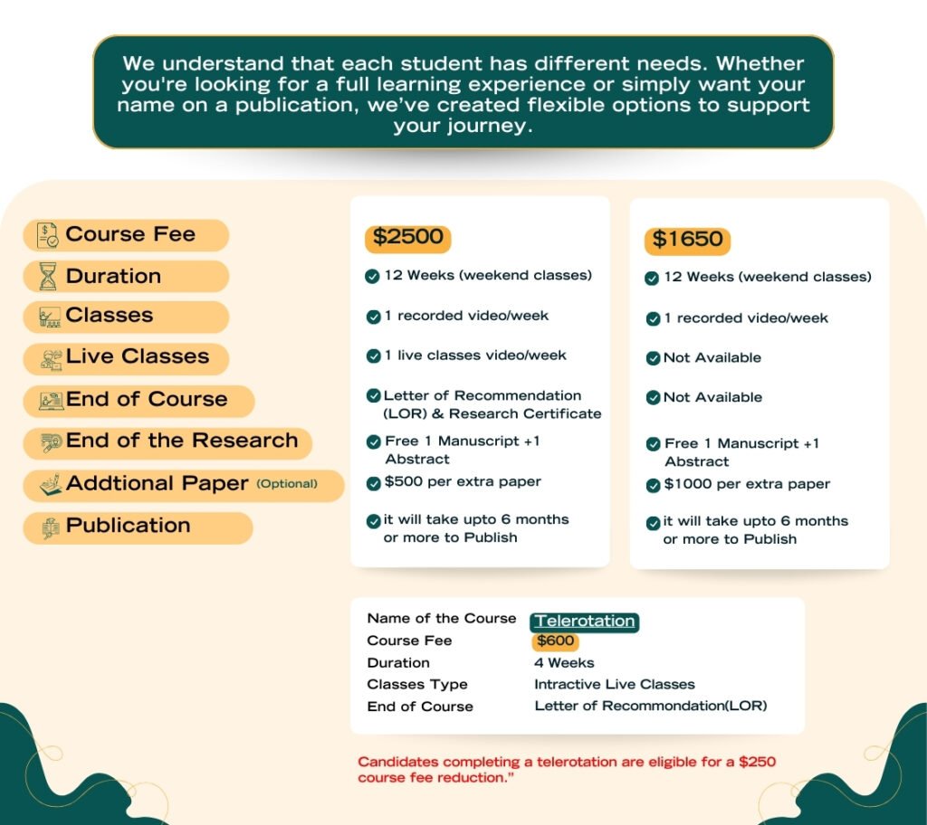 This in-depth course equips participants with fundamental clinical research skills,providing hands-on experience in collaborative research projects , It also prepares students to confidently discuss their research expertise during residency interviews , demonstrating their invlovement and understanding of the research process.