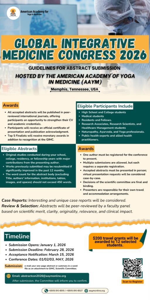 We invite high-quality research abstracts across all domains of integrative medicine, including Yoga, Ayurveda, clinical applications, diagnostics, rehabilitation, and emerging technologies. Share your research, innovation, or clinical experience with an international audience of medical professionals, scientists, and integrative health experts.