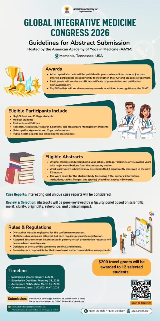 Submit your research abstract to contribute to the domains of integrative medicine including Yoga, Ayurveda, clinical applications, diagnostics, and emerging technologies. We welcome innovative ideas and findings from medical professionals, scientists, and integrative health experts worldwide.