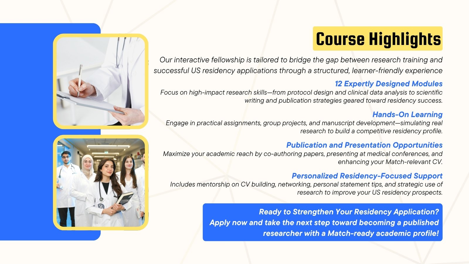 This in-depth course equips participants with fundamental clinical research skills, providing hands-on experience in collaborative research projects. It also prepares students to confidently discuss their research expertise during residency interviews, demonstrating their involvement and understanding of the research process.
